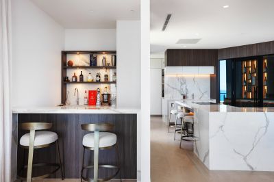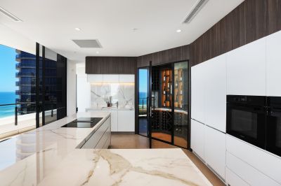 The spacious open plan living and dining area is perfect for entertaining, connecting seamlessly to a wraparound north-east facing balcony providing breathtaking, panoramic ocean views and the perfect space for relaxation or entertaining. The entertainer's kitchen is a standout feature, boasting an oversized butler's pantry, wet bar, Miele appliances, and a large wine cellar equipped with a Vintec bar fridge, ample storage and seating.