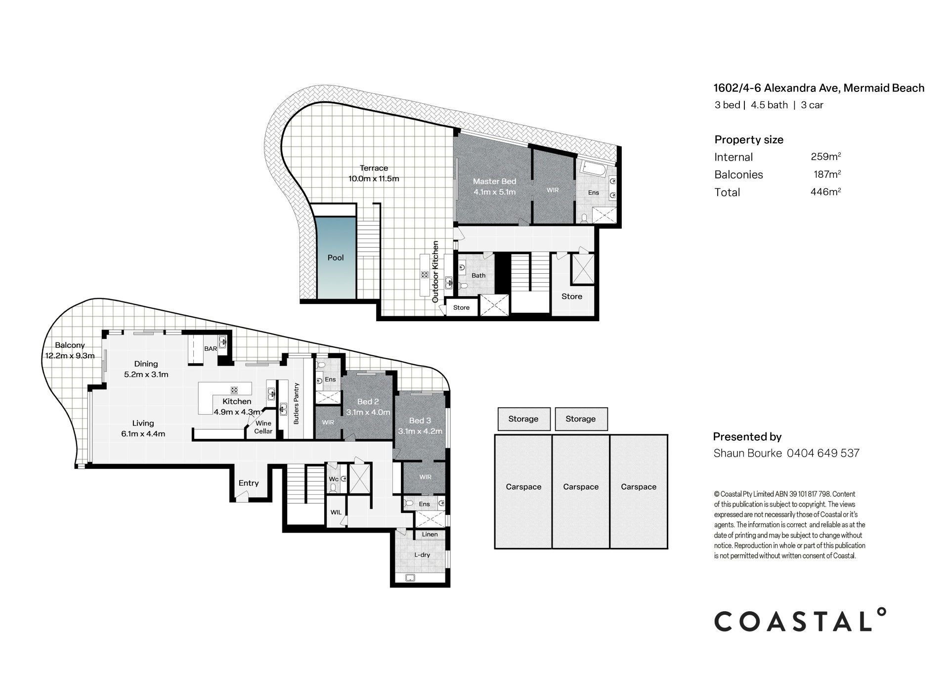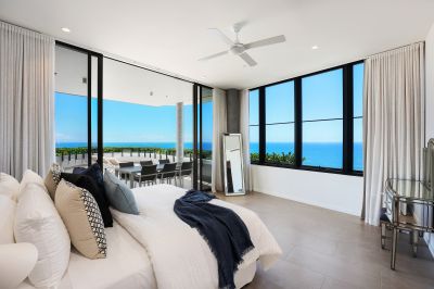 Enjoying a secluded setting on the upper floor, the master bedroom offers an oversized walk-in robe and a luxurious ensuite with freestanding bath and ocean views. The top floor also features a separate bathroom, easily accessible from the pool area for added convenience. On the lower floor, the second and third bedrooms also boast walk-in robes, ensuites, and access to a private east facing balcony.