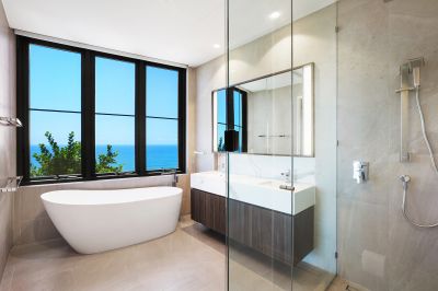 * Master bedroom on upper floor with oversized walk-in robe, ensuite with freestanding bathtub and ocean views