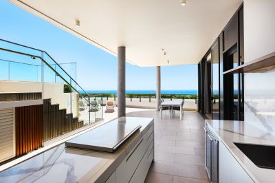 * Partially covered rooftop terrace with outdoor kitchen with Artusi gas barbecue, integrated Miele dishwasher and sink, private saltwater swimming pool and panoramic ocean and hinterland views