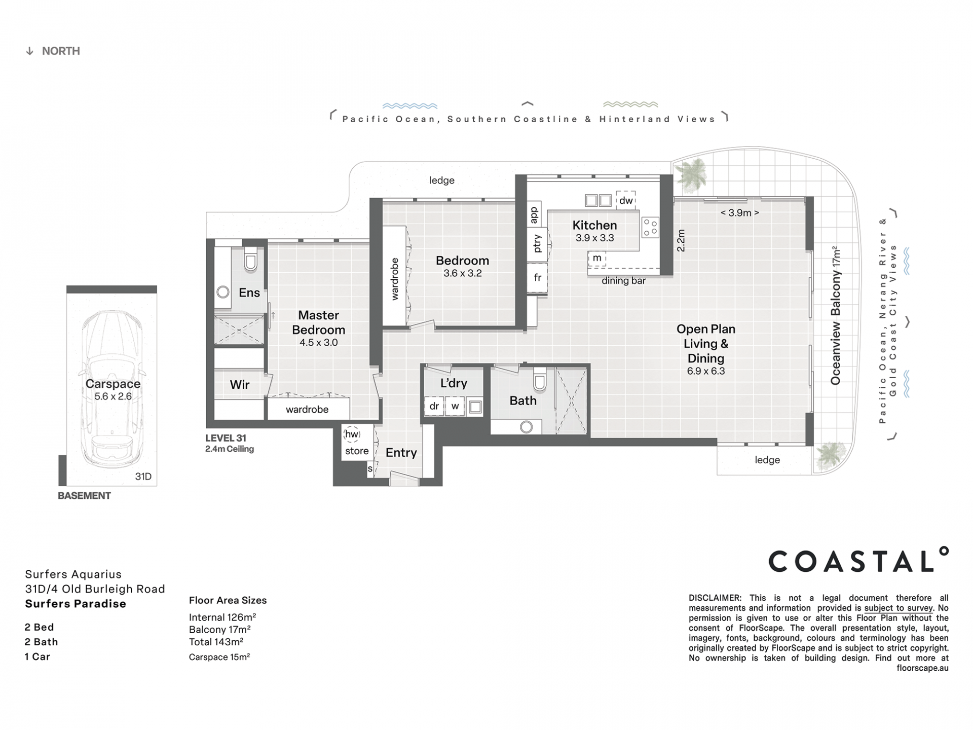 • Expansive 143m² floor plan with 2 bedrooms and 2 bathrooms