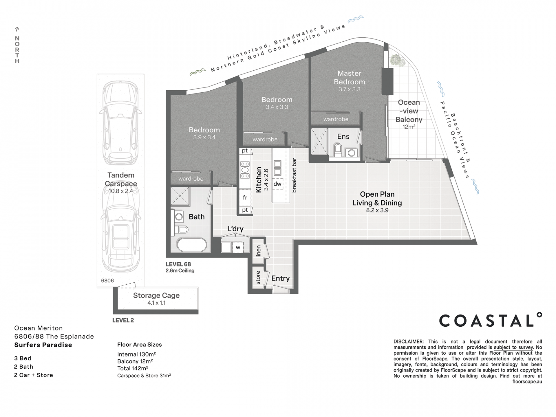Ocean, rising 76 levels against the Gold Coast skyline, is set to be an iconic Surfers Paradise beachfront landmark, bringing to life a new era in modern living, one where lifestyle, convenience and luxury meet. Situated high on the 68th floor with access to the high floor only express lifts, this spacious Sky-home boasts 3 large bedrooms, 2 bathrooms with panoramic views that stretch as far as the eye can see. Your living room windows frame unobstructed views of the endless Pacific Ocean, creating a canvas of ever-changing colours that will leave you in awe.